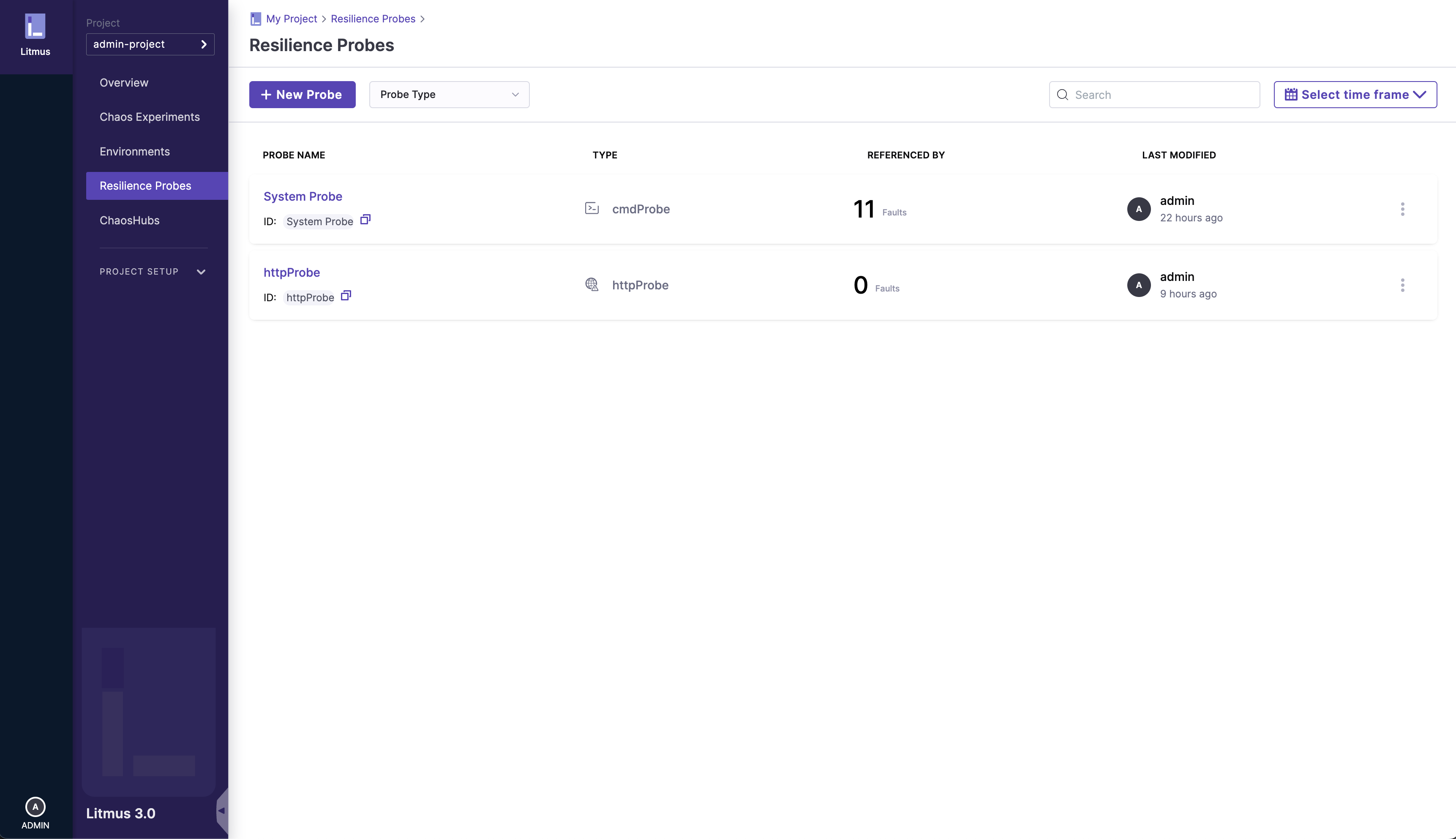 Navigate to the /probes page (Resilience Probes on the left nav), and click on the New Probe button.